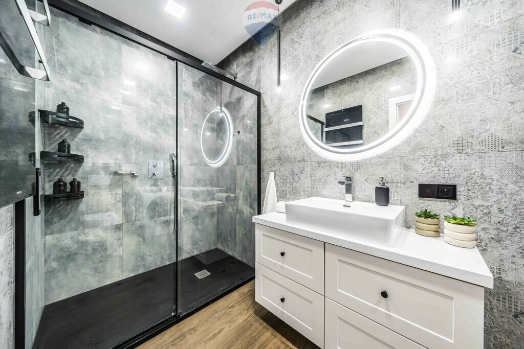 Łazienka z prysznicem typu walk-in, szafką pod zlew w zabudowie